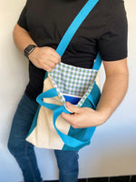 La sangle bleue apporte une touche marine moderne, soulignant l'essence rafraîchissante de ce sac. Mais l'histoire ne s'arrête pas là. À l'intérieur, découvre un monde de détails subtils avec une doublure en coton fin à carreaux, tous dans les tons apaisants de bleu. Chaque regard à l'intérieur est une invitation à l'évasion, rappelant les doux reflets de l'océan.