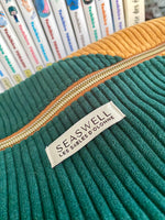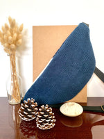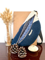 Sac entièrement en velours côtelé, bicolore avec une couleur dominante (ici le bleu) et une couleur mineure (ici le blanc cassé).
