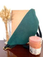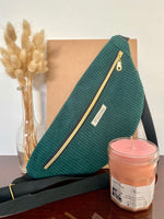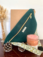 Sac banane en velours côtelé vert forêt, chic et sobre, il saura te faire briller en société grâce à son accastillage et sa fermeture dorées. Son intérieur fleuri en coton révélera ton côté fun tout en restant sobre à l'extérieur !