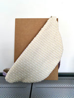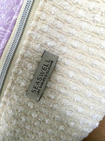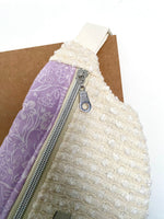 Son extérieur est composé d'un joli tissu en coton texturé blanc cassé qui se marie parfaitement avec un tissu coton parme imprimé floral.